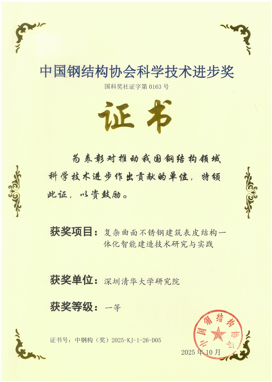 日前,中国钢结构协会第九届会员代表大会暨2025中国钢结构大会在广西南宁召开。清华大学土木工程系教授、深圳清华大学研究院钢结构建筑智慧建造实验室王元清教授团队基于“生命之树”工程的“复杂曲面不锈钢建筑表皮结构一体化智能建造技术研究与实践”项目荣获中国钢结构协会科学技术进步奖一等奖。